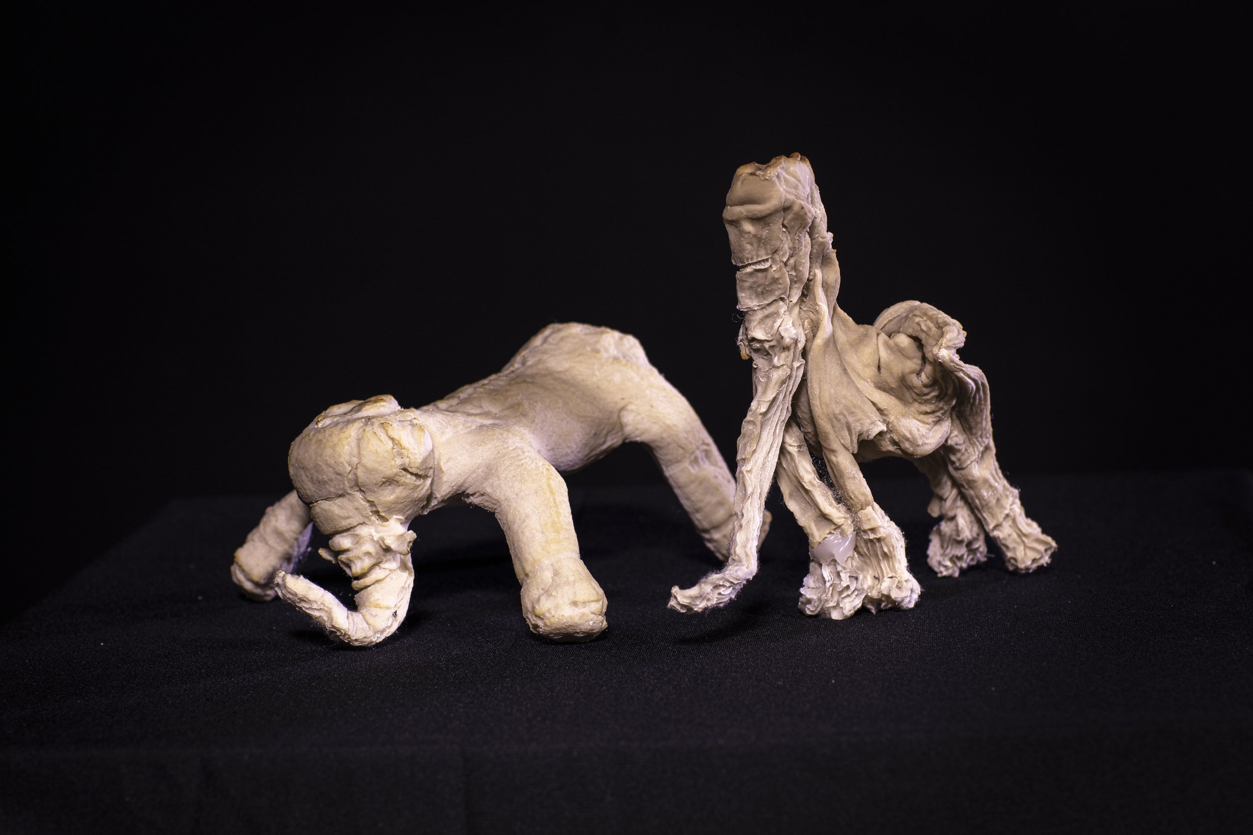The results of a nanocellulose casting are unpredictable due to the novelty of the process. Both ingenuity and intuition are required to guide the material as it responds to environmental conditions, dries, and gradually settles into its final state. When researching how new processes of artistic actions affect it, I strike a balance between my goals and intentions for the work, and a certain degree of inevitable chaos and distortion. My use of cloth molds results in relatively large, solid forms which take shape slowly but steadily, aided by the permeability of the textile material. By casting nanocellulose pulp into forms which underscore its origins as a biological product rather than veiling them, I aim to inspire the viewer with a new appreciation for the interconnectedness of Earthly life, and our imperative, opportunity, and calling to take better care of it. In order to achieve such an effect as works of art, I believe the castings must be enlarged to the “human scale” and approach or exceed life-sized proportions for their given subject. Only when the viewer can relate personally to the material can its true potential be communicated.